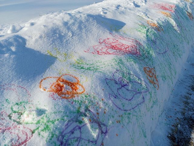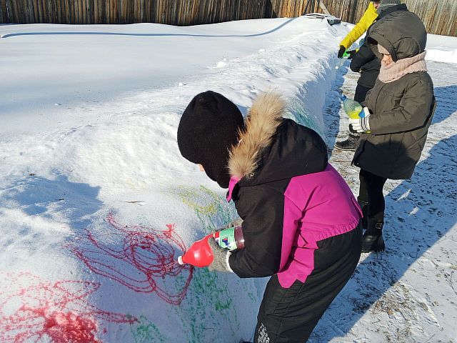К счастью, у ребят из клуба «Добродел» были большие запасы красок – результат прошлых творческих проектов по программе комплексных занятий «Разноцветные ладошки». И вот, вооружившись безграничной фантазией, ребята вышли на улицу. Белые холсты сугробов ждали своих художников.